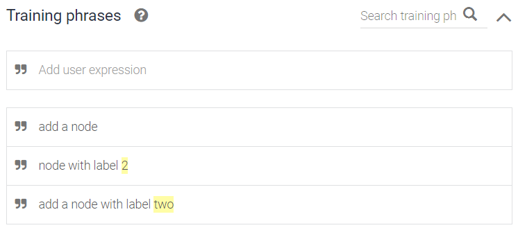 Observe that “nodeAdded” intent is trained with a single sentence, the one the web app “speak” when the action is completed on its side.